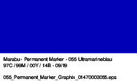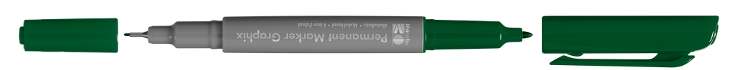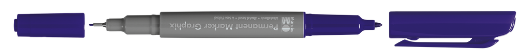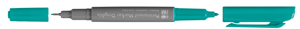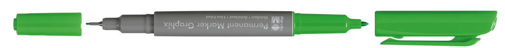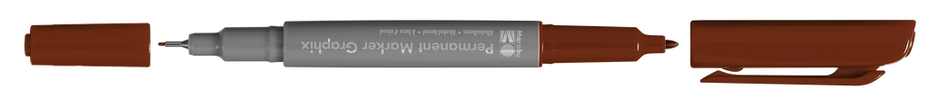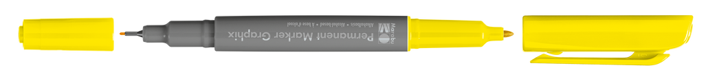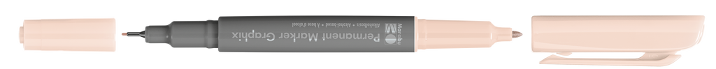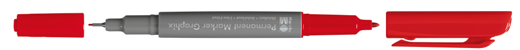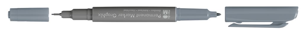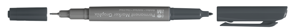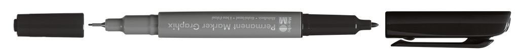 Permanentni marker z dvema konicama Marabu Permanent Marker Graphix. Kvalitetno alkoholno črnilo na osnovi organskih topil (brez toluena/ksilena) zagotavlja živahne barve (brez močnega vonja), ki se ne razmažejo, se hitro sušijo in so vodoodporne. Marker ima konici dveh debelin: debelejšo 1-2 mm vlaknasto konico ter ultra tanko 0,5 mm v kovino obdano plastično konico. Vsaka konica ima svoj pokrovček, debelejša konica ima pokrovček s sponko. Marker je primeren za uporabo na številnih podlagah in je popolno orodje za ilustracije, skice, končne umetnine in mnogo več. Na voljo v številnih barvah.