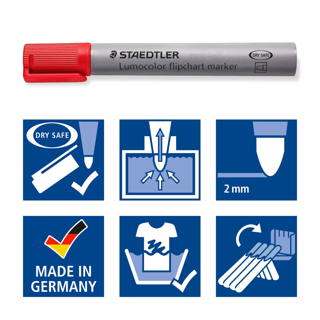 Marker za pisanje po demo blokih (flipchart). Univerzalno pisalo idealno za uporabo na papirju saj črnilo ne pronica skozenj. Vsebuje hitro sušeče vodotopno črnilo brez izrazitega vonja, ki je možno odstraniti iz večino tkanin. Polipropilensko ohišje in pokrovček zagotavljata dolgo življenjsko dobo. DRY SAFE sistem poskrbi, da je pisalo lahko brez pokrovčka do 2 dni ne da bi se pri tem črnilo izsušilo. Debelina črte je približno 2 mm. Set vsebuje 4 flomastre v STAEDTLER-jevem etuiju.