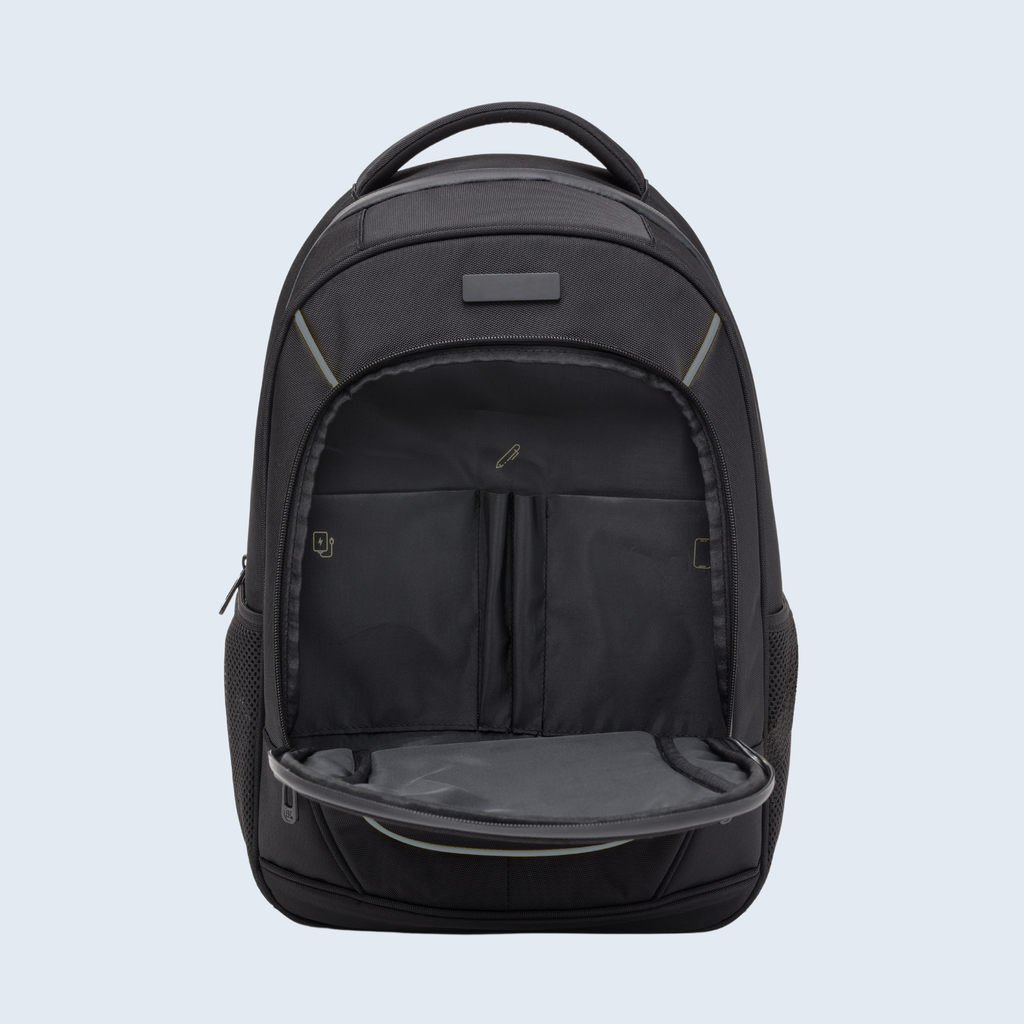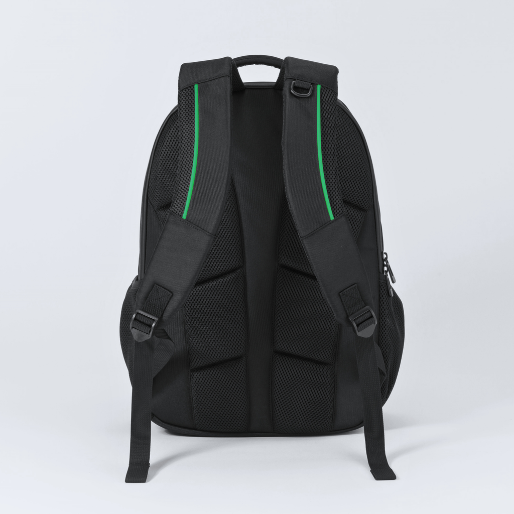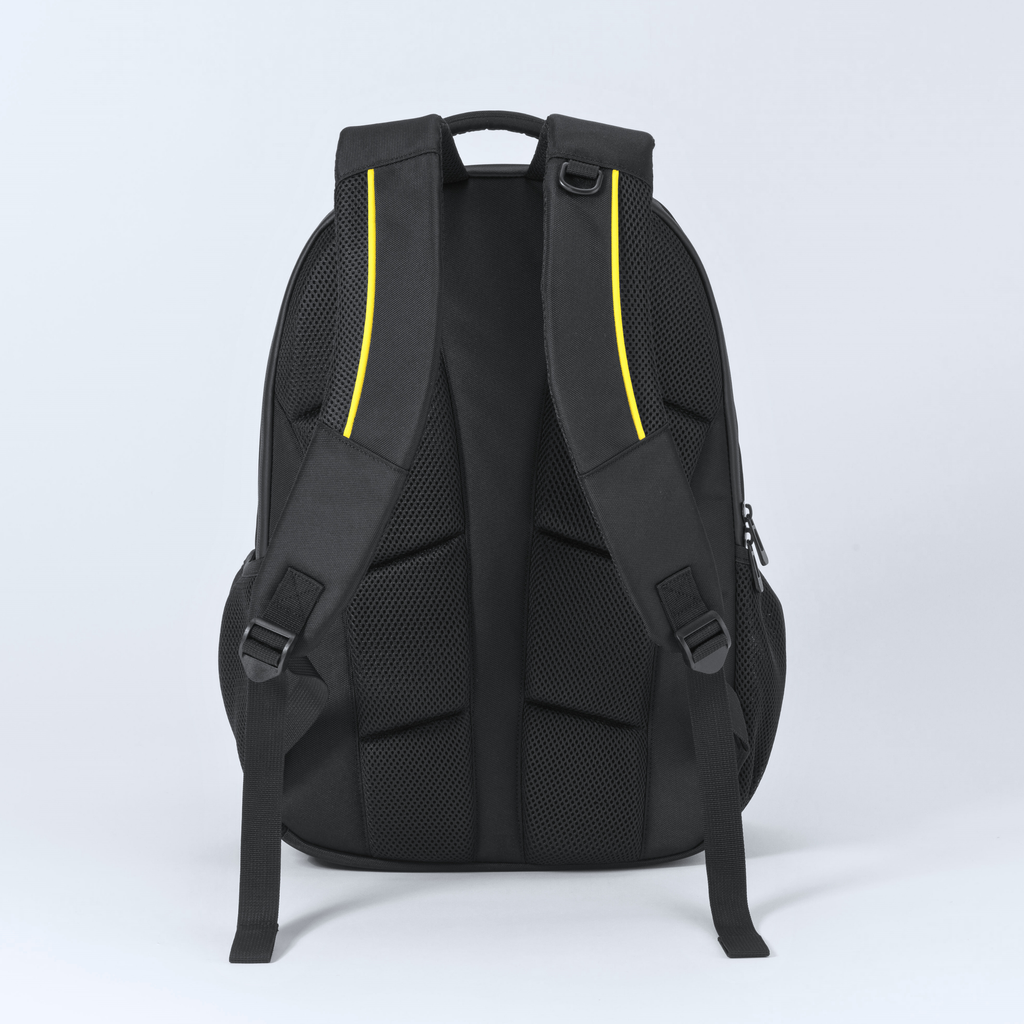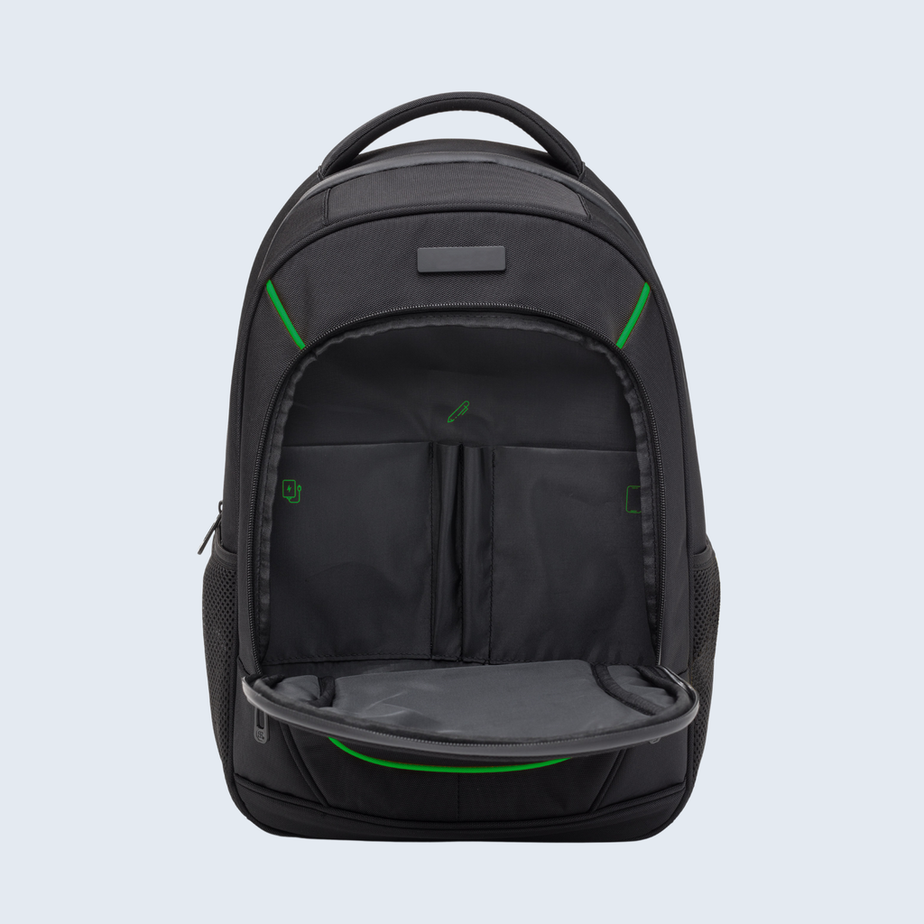 Z dvema predalčkoma, velik predal z zadrgo, sprednji žep z zadrgo, stranski mrežasti žep, podložene in nastavljive naramnice, zračni hrbtni sistem, iz poliestra 1260D, 21 l. 460 × 310 × 150 mm.