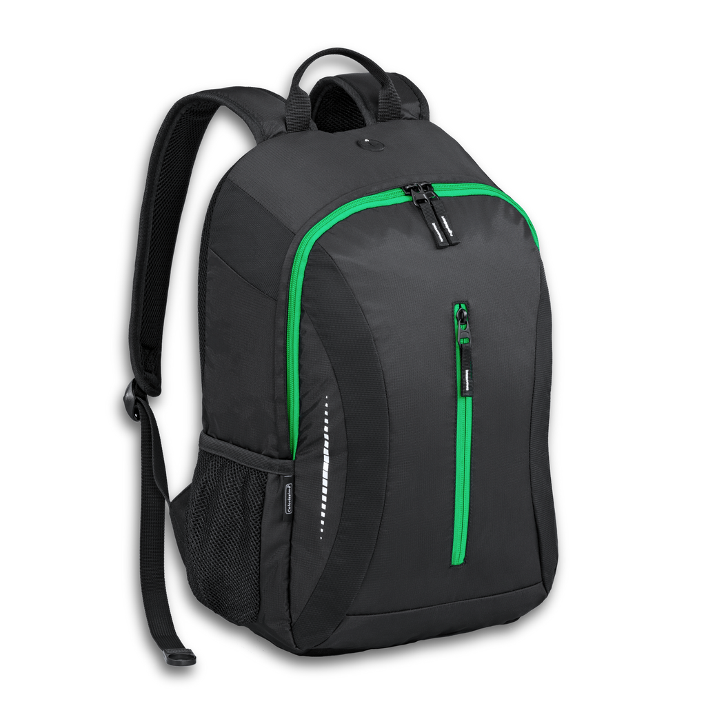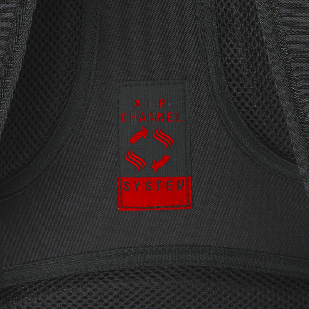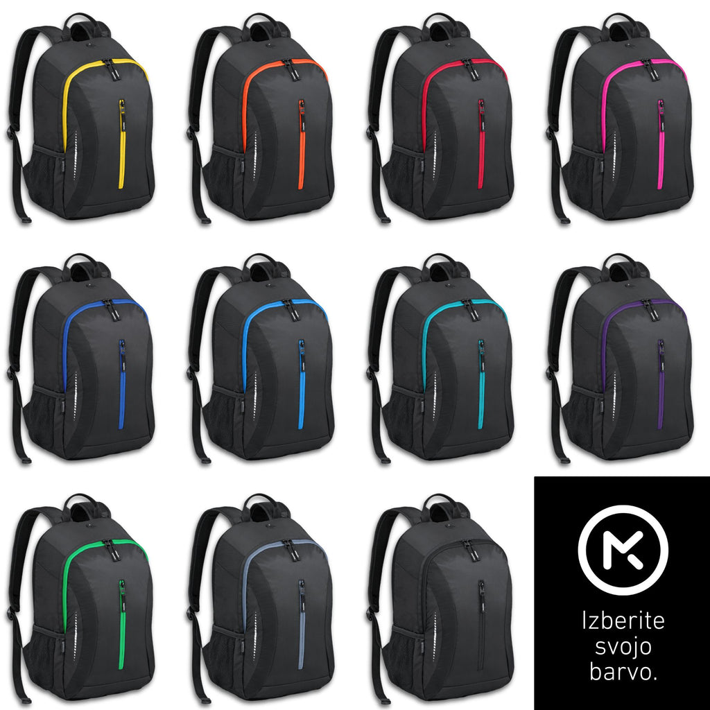 Iz najlona in poliestra 600D, z ojačanim zračnim hrbtiščem, odsevniki in odprtino za slušalke ter majnihm sprednjim žepom na zadrgo.