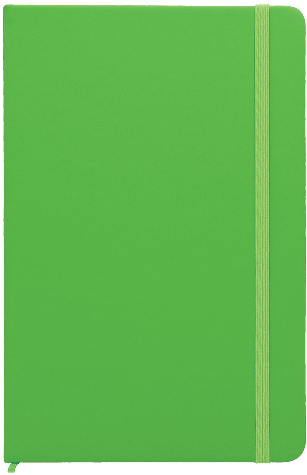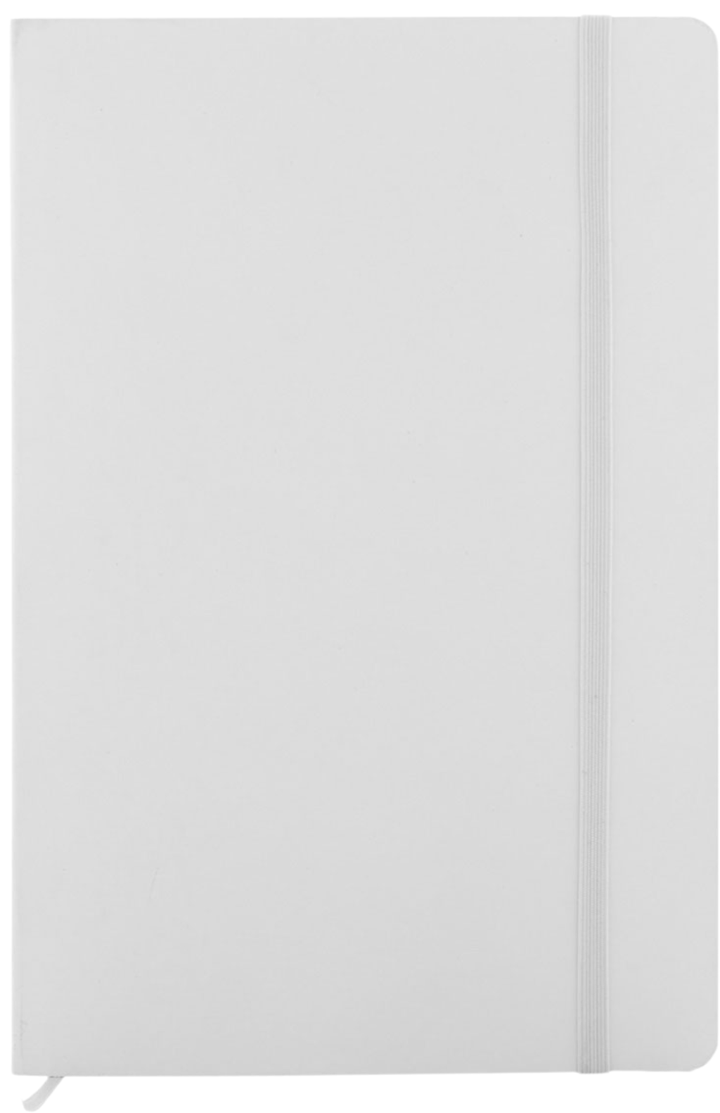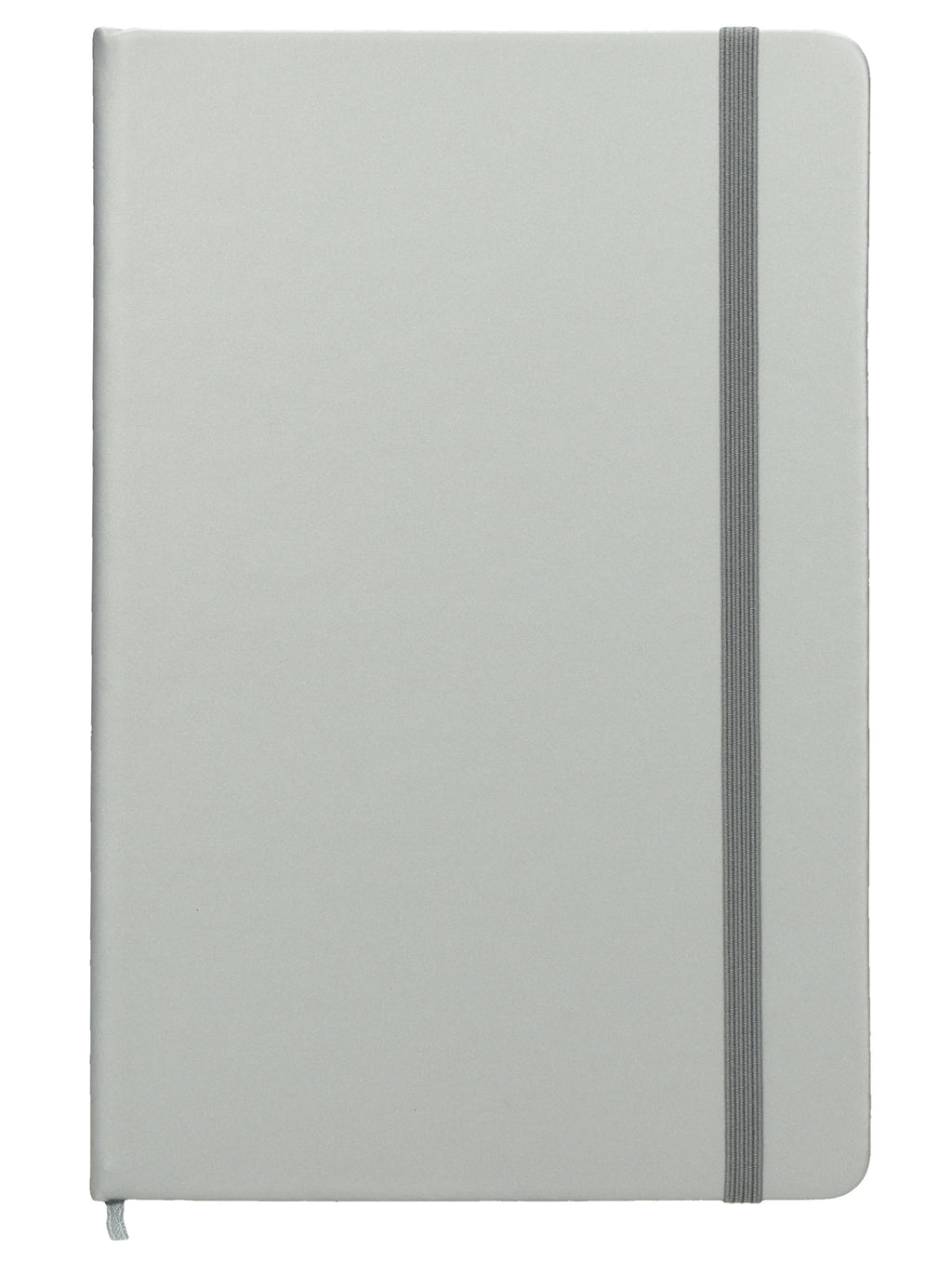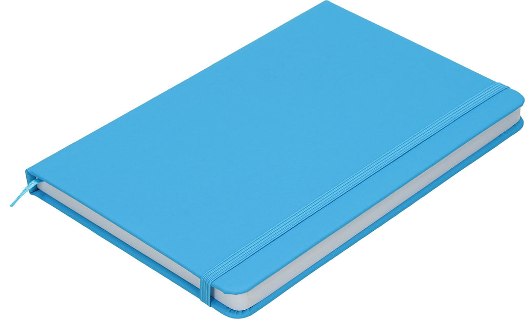 Lepljen notesnik, 192 strani, dodan označevalni trak, črtan, elastika in trak v barvi platnice. Dimenzije: 14 x 21 cm. Pakirano po 50 kos.