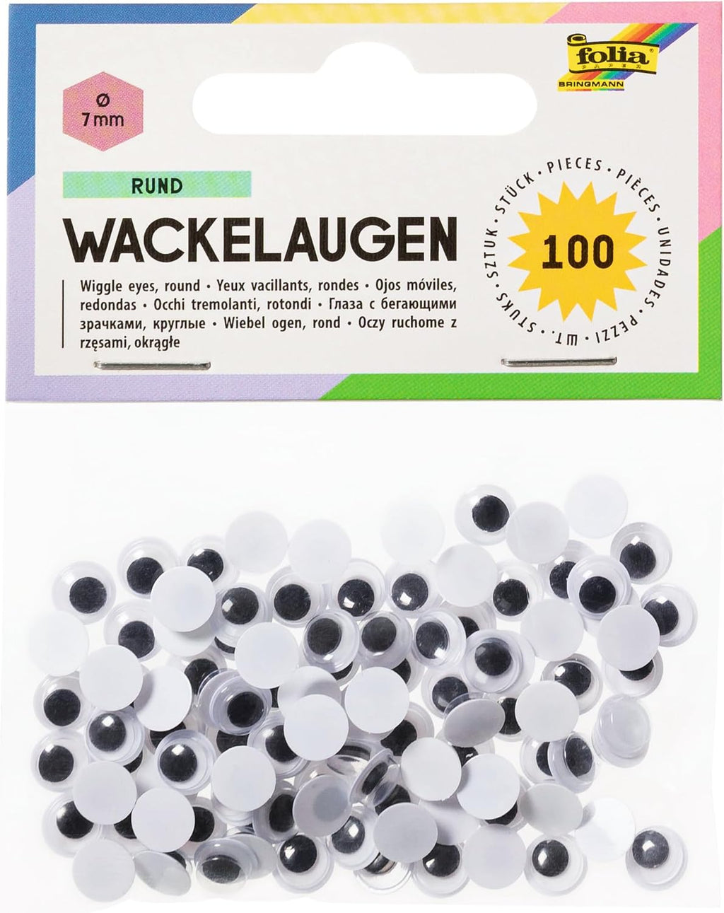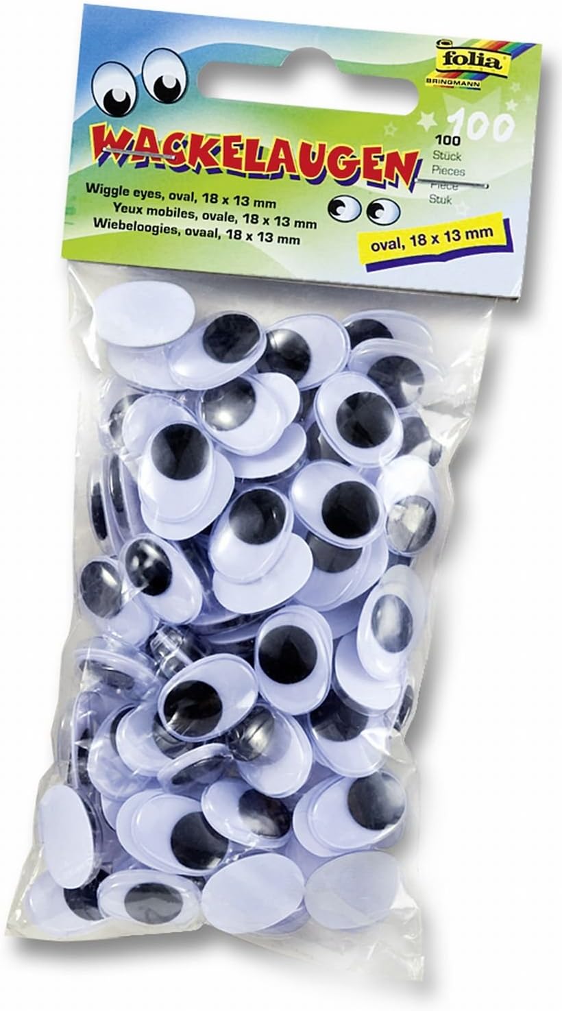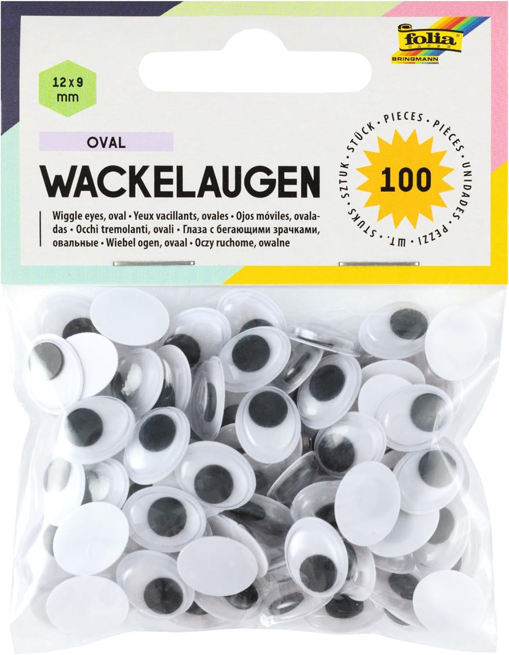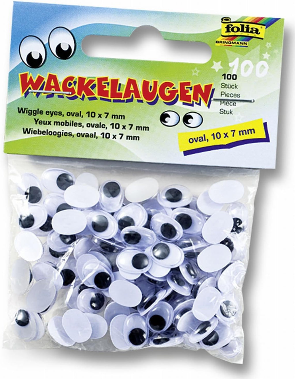 Dekorativni dodatek v obliki gibljivih oči za šaljiv izgled različnih lutk ali živalic. Na voljo v okrogli ali ovalni obliki, v različnih dimenzijah. V zavitku je 100 kosov.