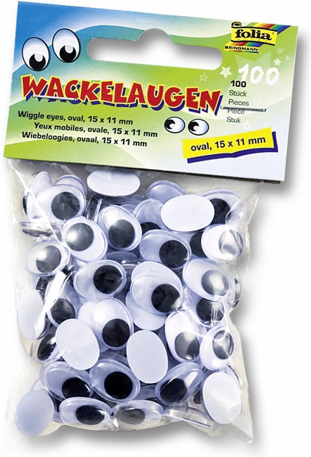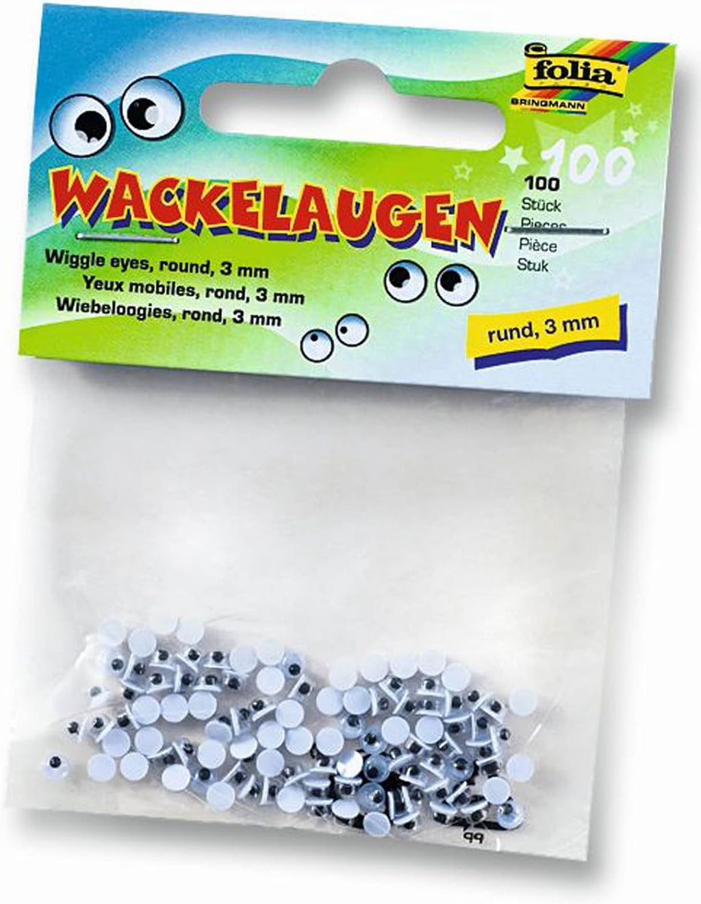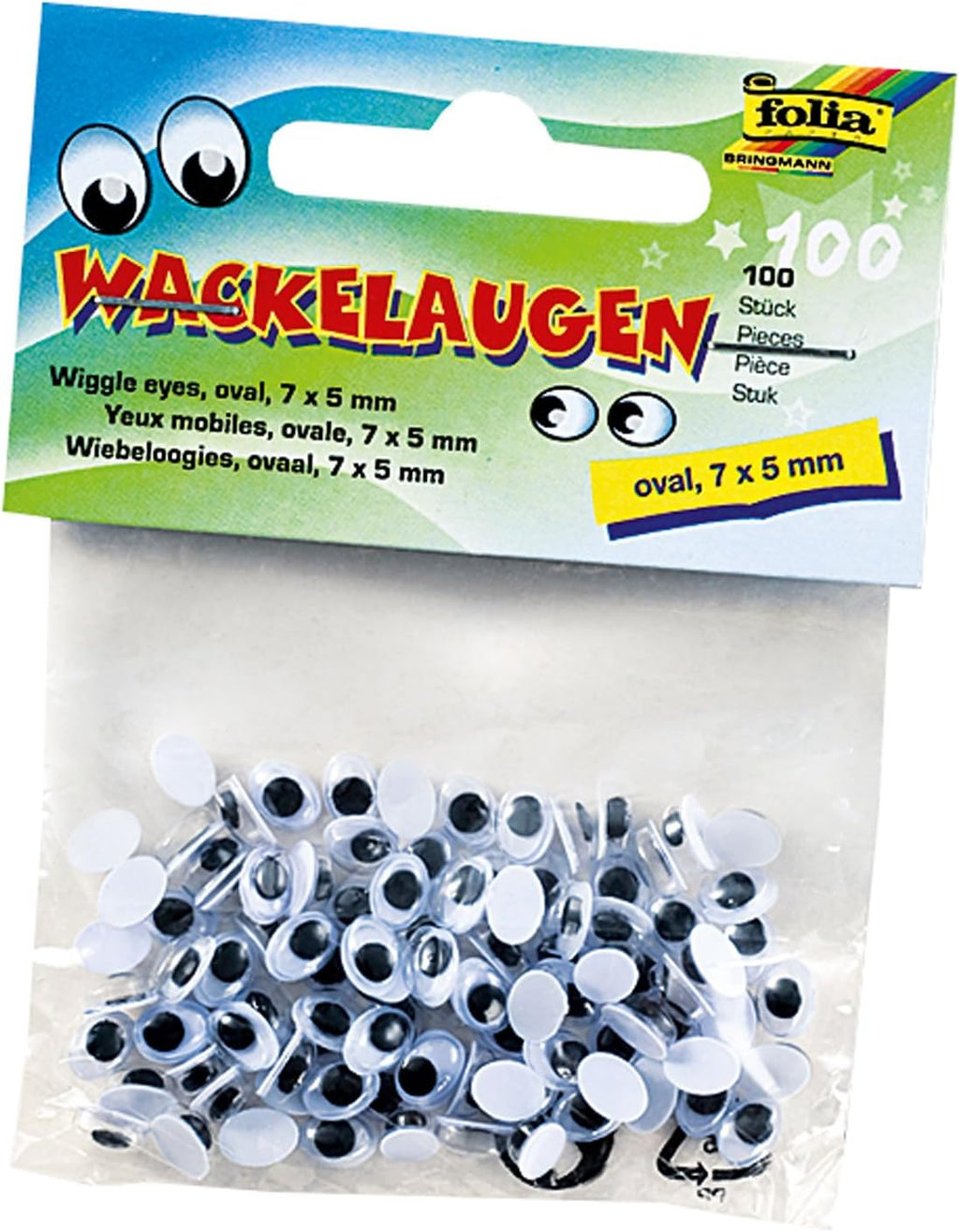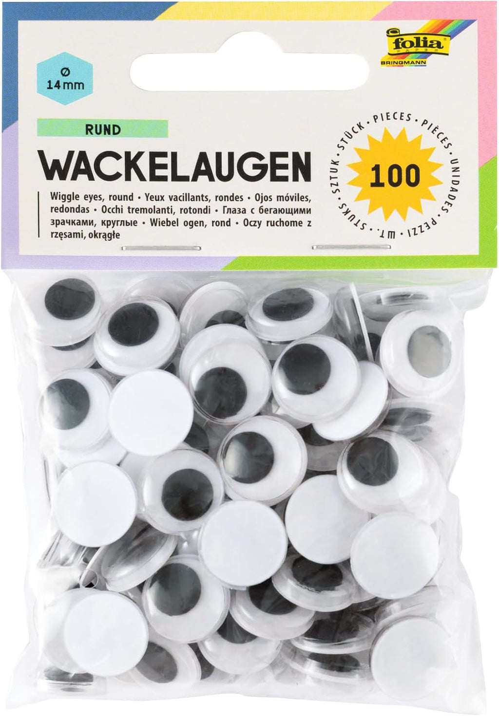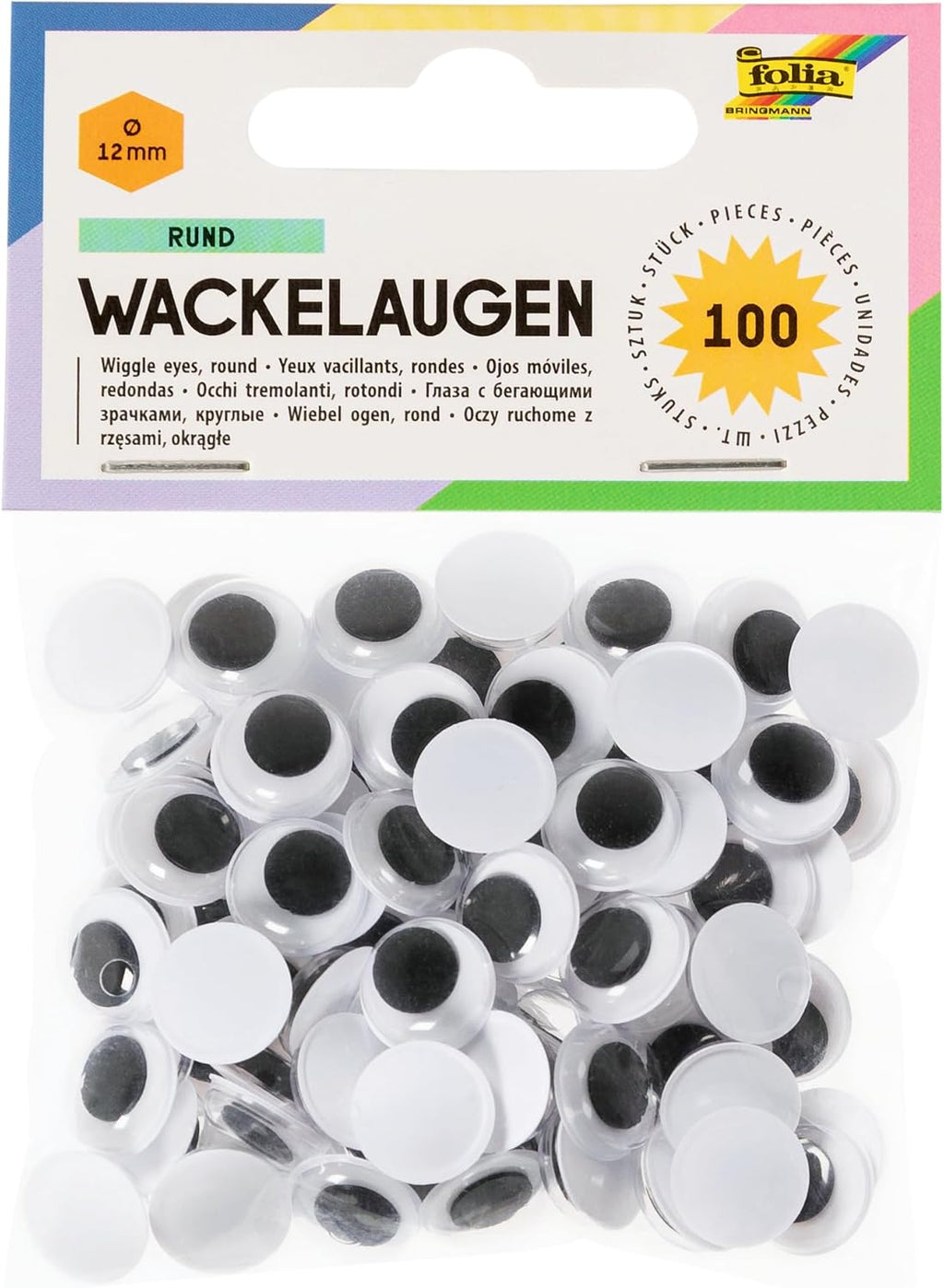 Dekorativni dodatek v obliki gibljivih oči za šaljiv izgled različnih lutk ali živalic. Na voljo v okrogli ali ovalni obliki, v različnih dimenzijah. V zavitku je 100 kosov.