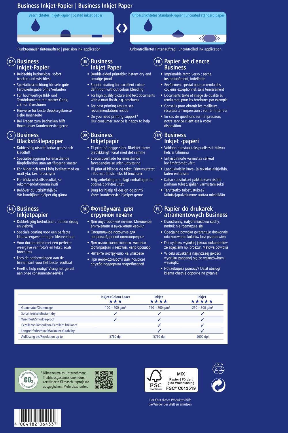 V zavitku je 50 listov. Foto papir Business s posebnim premazom je primeren za tiskanje z inkjet tiskalniki. Barva se takoj posuši in ne pušča madežev, natiskane barve so naravne in sijoče. Potiskate ga lahko po obeh straneh. Idealen za brošure, letake, cenike, jedilnike in številne druge dokumente. Papir je beljen brez klora in je izdelan iz 100 % papirnega materiala s certifikatom FSC® - odgovorno upravljani gozdovi.