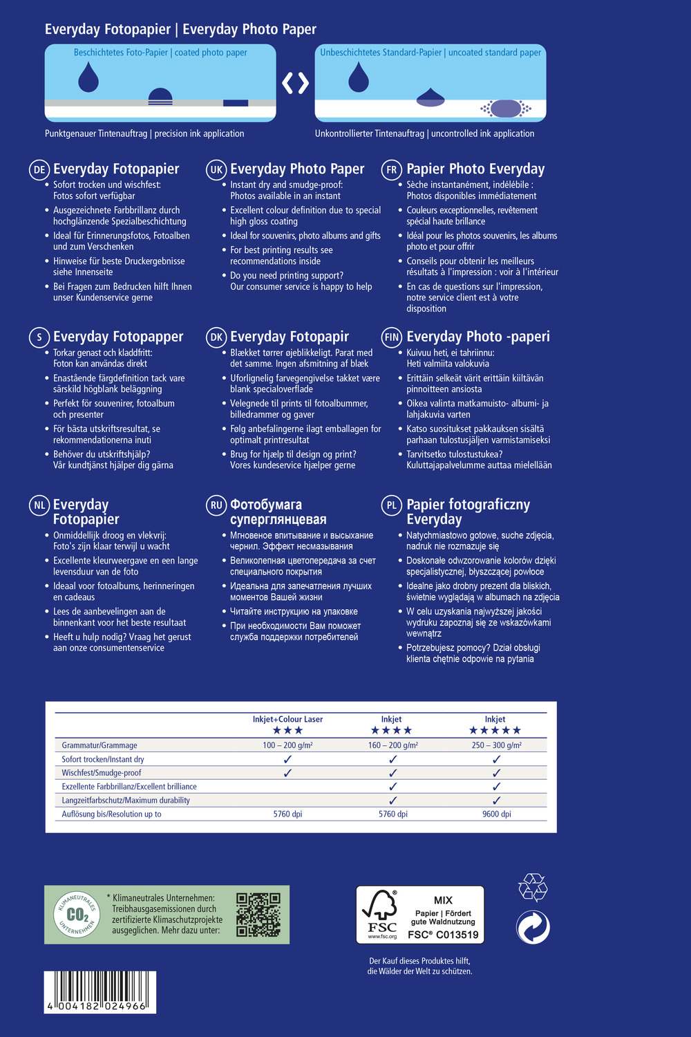 V zavitku je 100 listov. Foto papir Every Day s posebnim premazom je primeren za tiskanje z inkjet tiskalniki. Barva se takoj posuši in ne pušča madežev, natiskane barve so naravne in sijoče. Idealen za tiskanje fotografij. Papir je beljen brez klora in je izdelan iz 100 % papirnega materiala s certifikatom FSC® - odgovorno upravljani gozdovi.