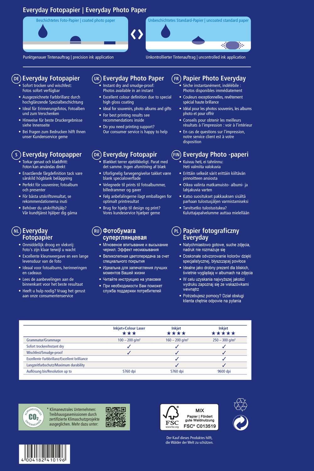 V zavitku je 50 listov. Foto papir Every Day s posebnim premazom je primeren za tiskanje z inkjet tiskalniki. Barva se takoj posuši in ne pušča madežev, natiskane barve so naravne in sijoče. Idealen za tiskanje fotografij. Papir je beljen brez klora in je izdelan iz 100 % papirnega materiala s certifikatom FSC® - odgovorno upravljani gozdovi.