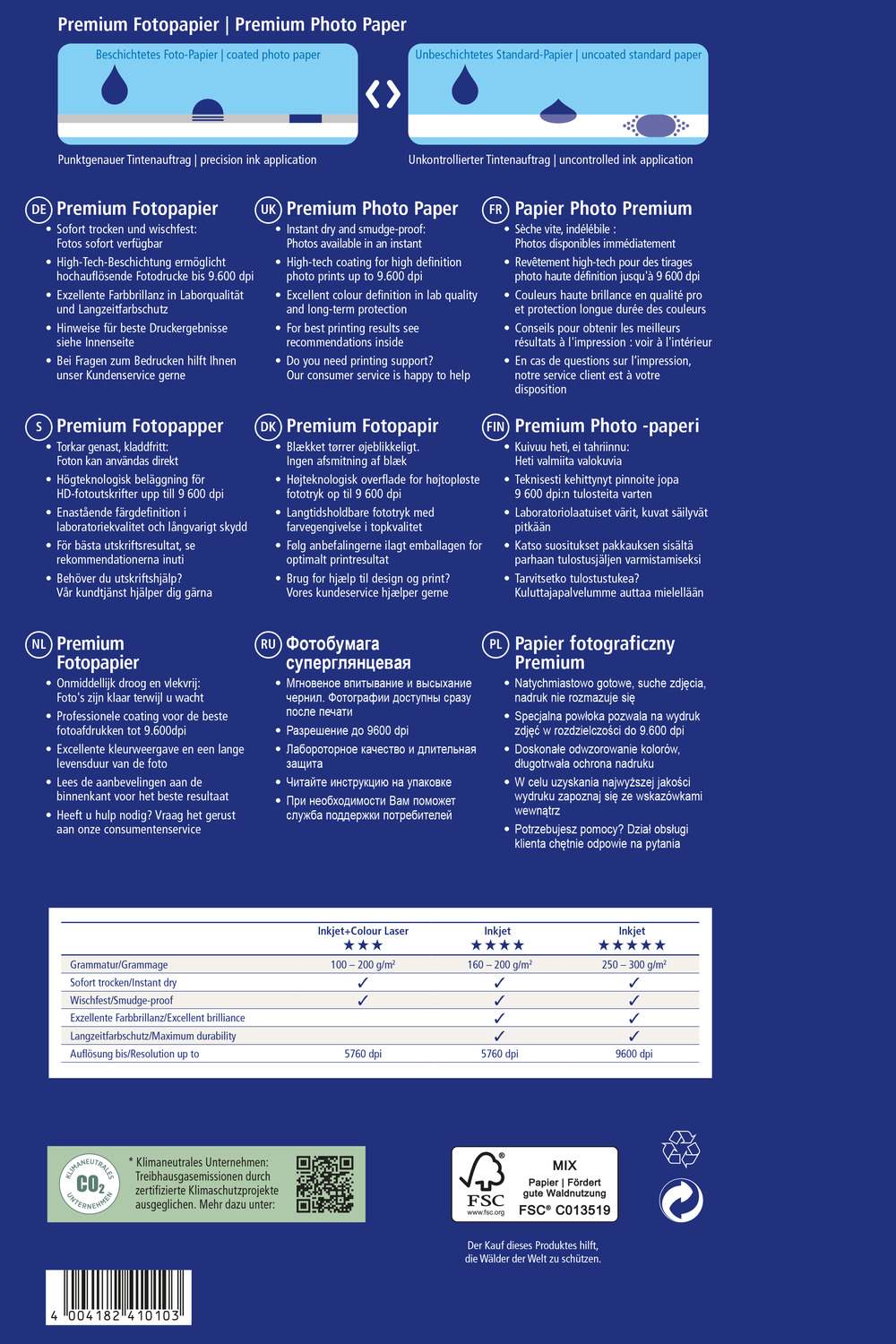 V zavitku je 20 listov. Foto papir Premium s posebnim premazom je primeren za tiskanje z inkjet tiskalniki. Barva se takoj posuši in ne pušča madežev, natiskane barve so naravne in sijoče. Idealen za tiskanje fotografij. Papir je beljen brez klora in je izdelan iz 100 % papirnega materiala s certifikatom FSC® - odgovorno upravljani gozdovi.