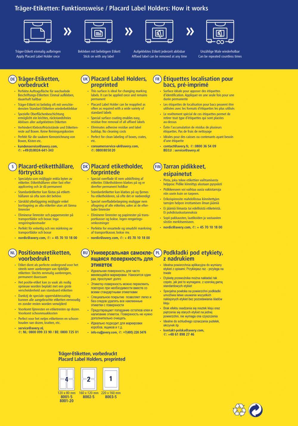 V zavitku je 20 listov, vseh podlag je 80. Inovativne podlage za etikete imajo poseben premaz. Nalepke lahko na podlage lepite vedno znova, stare etikete enostavno odstranite in prilepite nove. Idealne so za označevanje zabojnikov, transportnih škatel in polic v logistiki in skladiščih. Izdelano v Nemčiji.