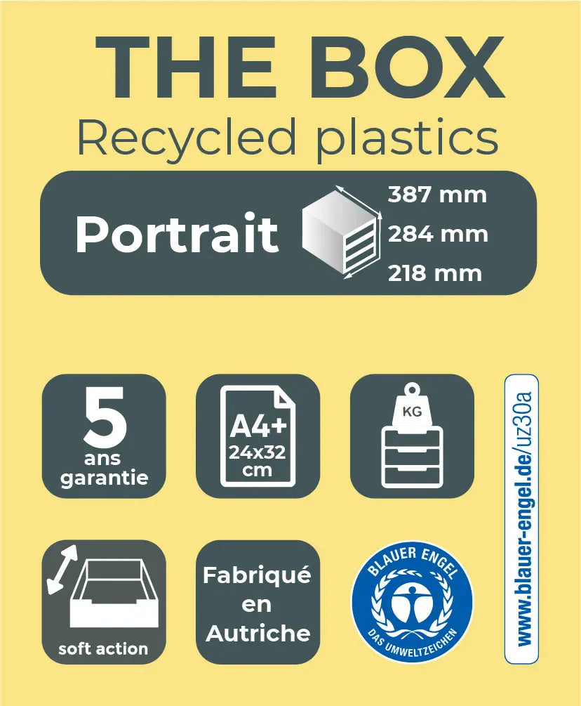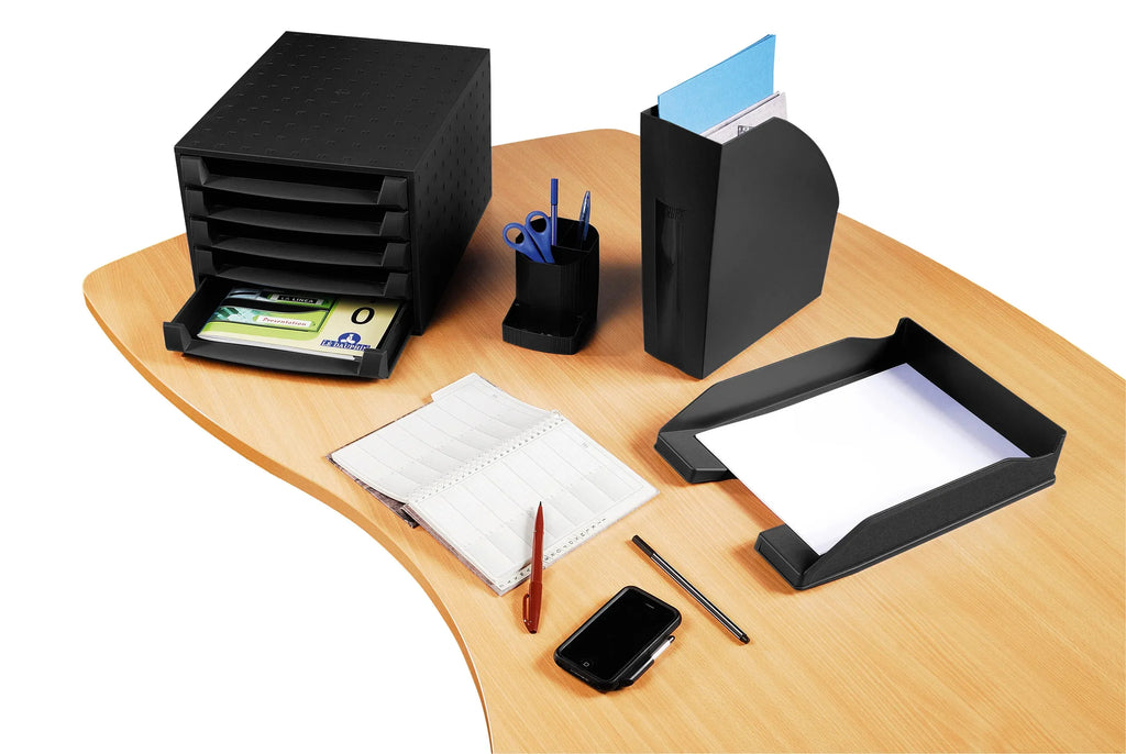 Predalnik Exacompta EcoBlack Recycled The Box s 5 odprtimi predali višine 38 mm. Namenjen shranjevanju dokumentov velikosti A4+. Za odlaganje dokumnetov predalov ni treba odpirati. Predali imajo zaporo, ki preprečuje, da bi predal izpadel iz ohišja. Predalnik je izdelan iz odpadne plastike, ima certifikat Blue Angel ter 5 letno garancijo. Dimenzije predalnika: 387 x 284 x 218 mm, teža: 3.066 g.