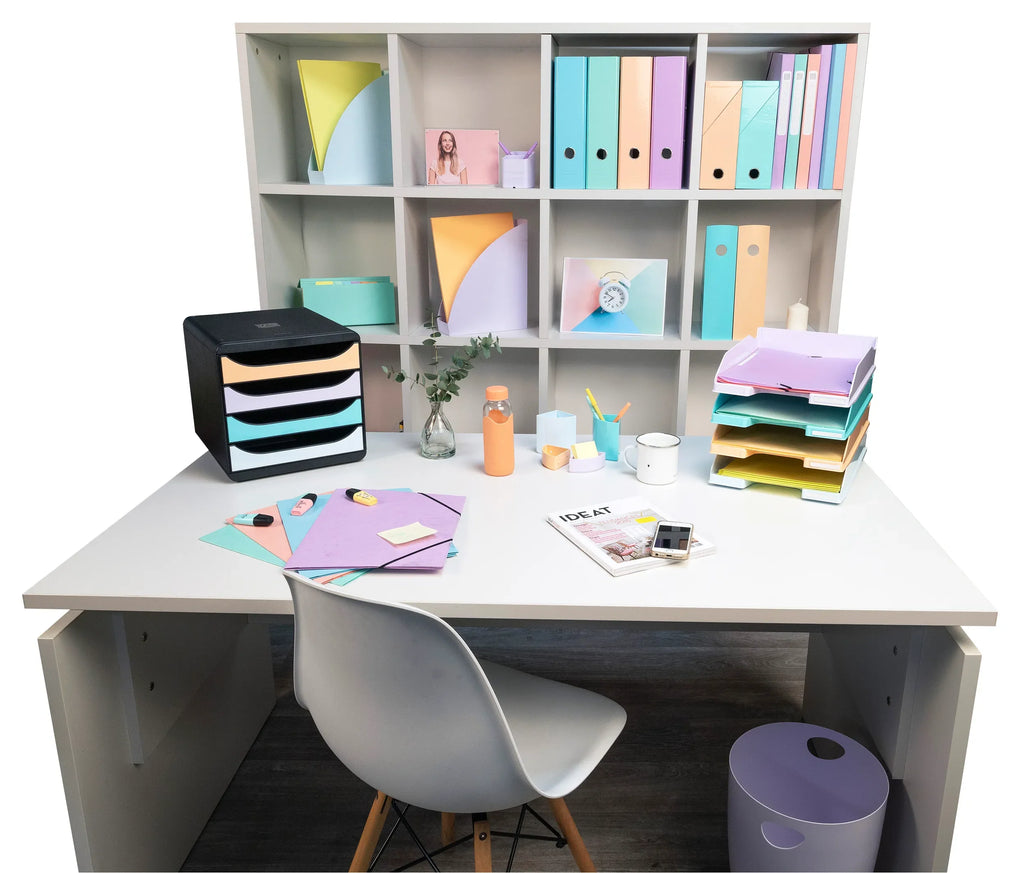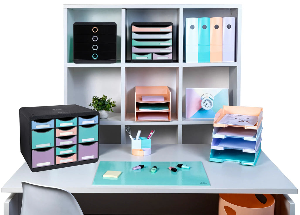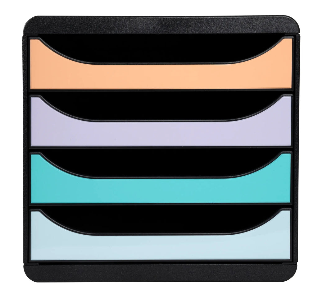 Exacompta BigBox Office je predalnik s 4 predali v črno-pastelni kombinaciji. Predali višine 55 mm so idealni za shranjevanje dokumentov formata A4+, se gladko zapirajo in imajo zaporo, da jih ni mogoče nenamenoma izpuliti iz ohišja predalnika.