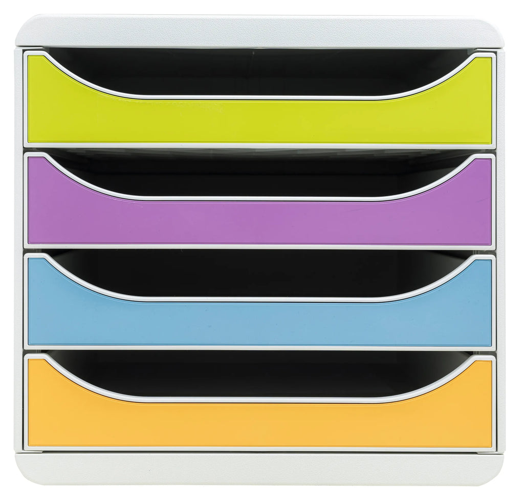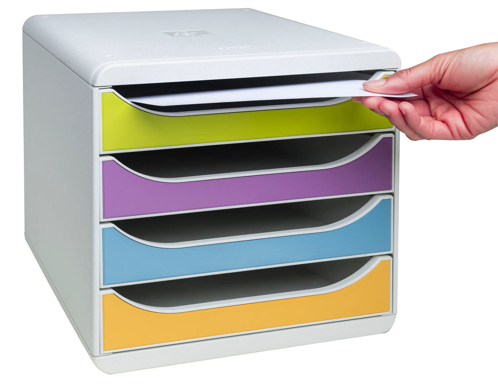 Ohišje predalnikov Exacompta Multiform BigBox je zasnovano v enem kosu, zato so te bolj odporni na obremenitve, so togi (se ne zvija) in je zato bolj vzdržljivi. Zahvaljujoč 4 reliefom, ki zagotavljajo stabilnost, je predalnike mogoče zlagati enega na drugega. Predali so prijetni za uporabo, drsni in tihi, opremljeni z varnostnim zaporo. Izdelan iz reciklirane plastike iz gospodinjskih odpadkov in ima zato certifikat Blue Angel. 25 let garancije.