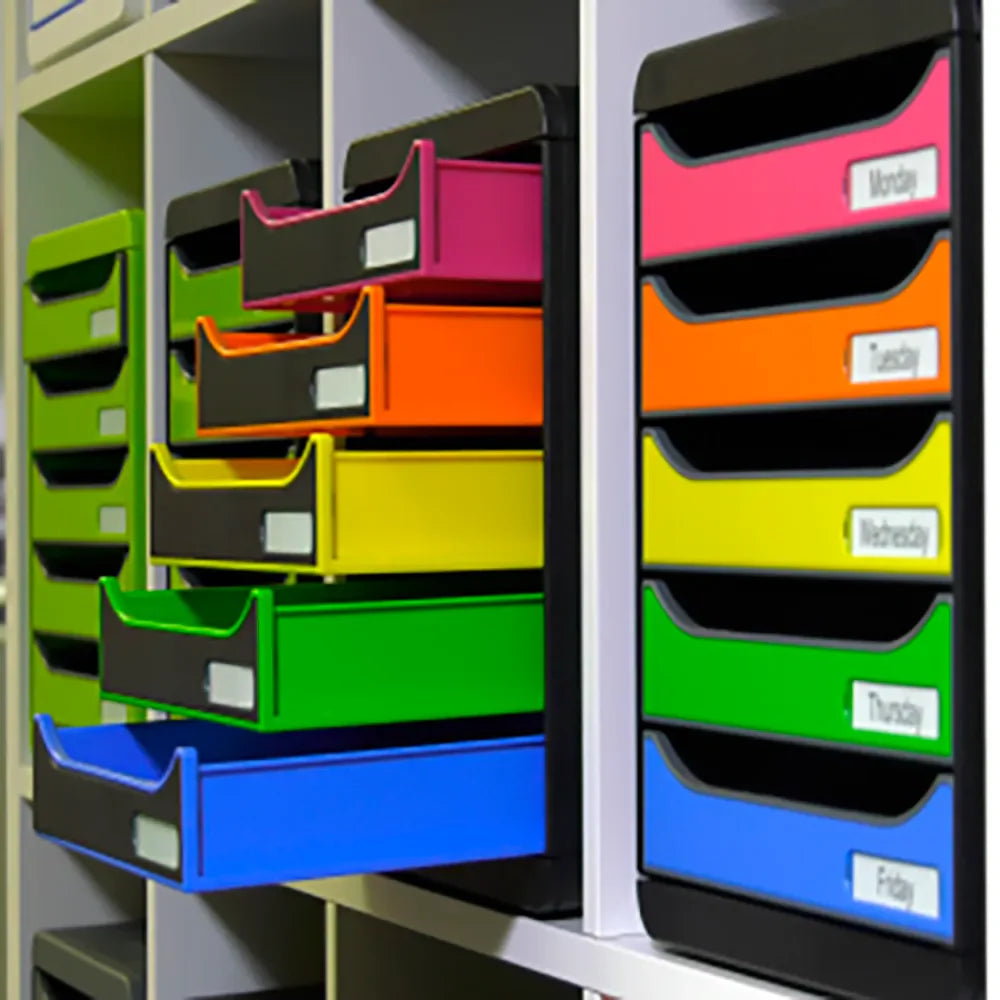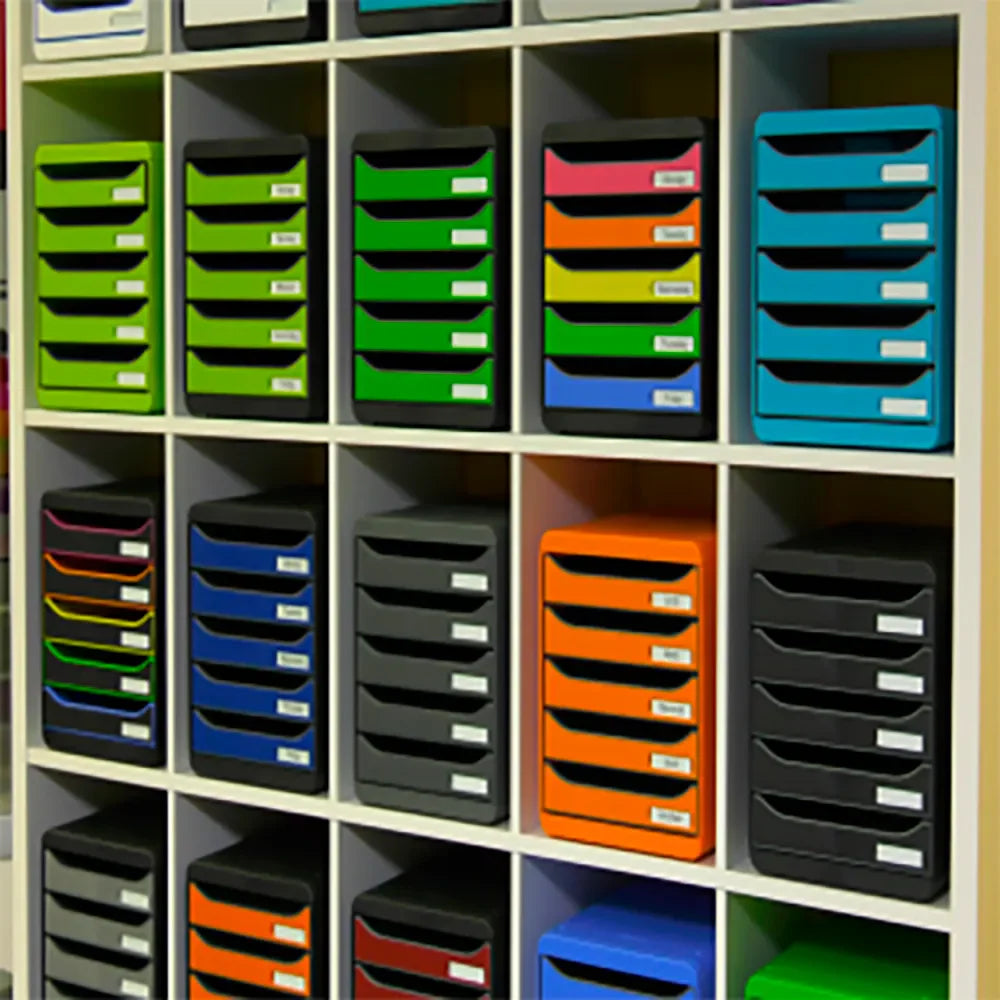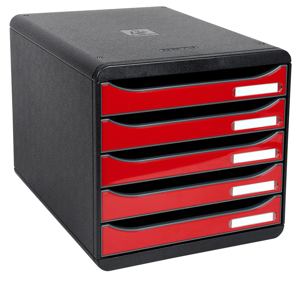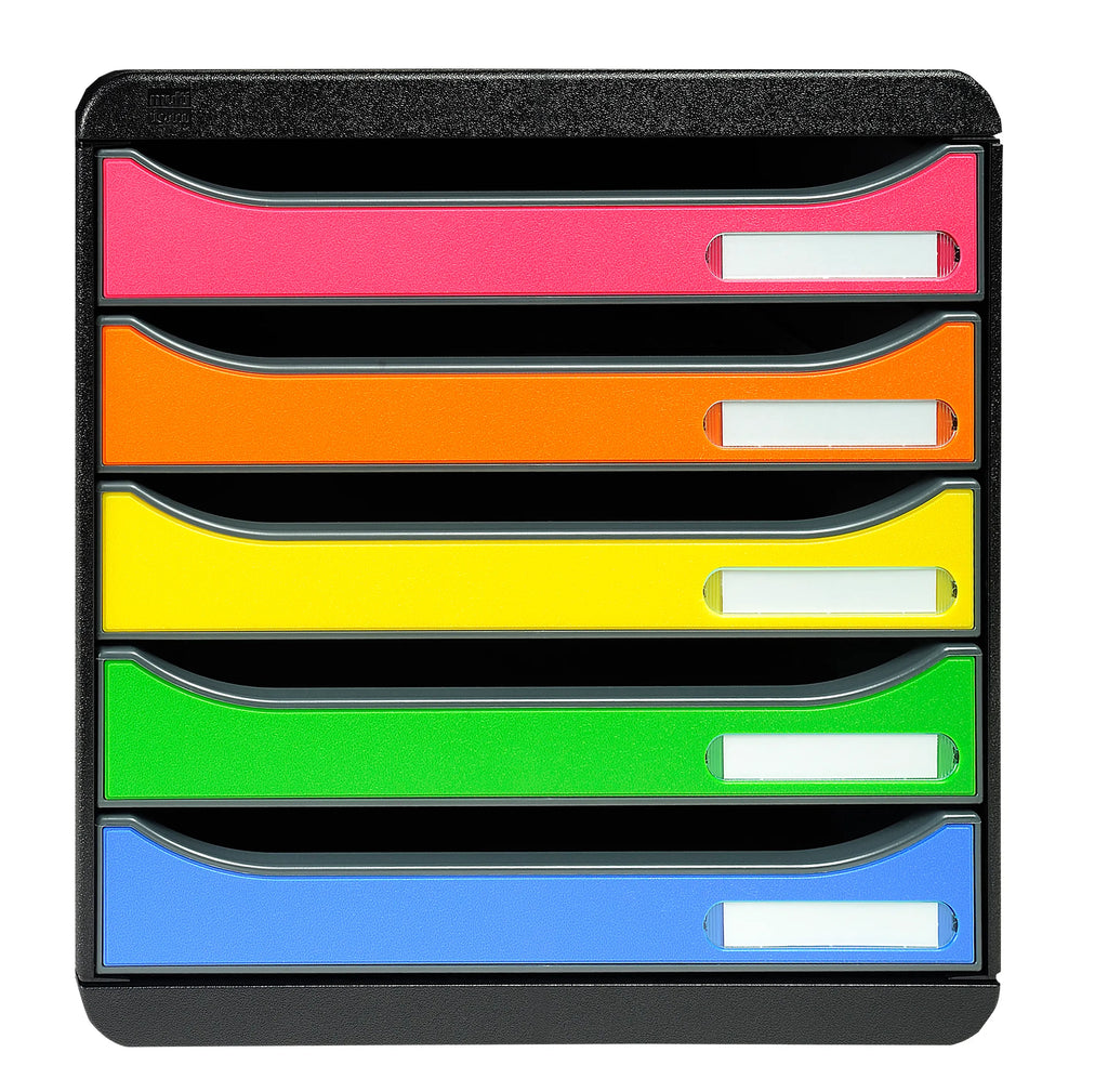 Exacompta BigBox Plus je predalnik s 5 predali višine 43 mm, v črno-pisani kombinaciji. Predali so idelani za shranjevanje dokumentov formata A4+, se gladko zapirajo in imajo zaporo, da jih ni mogoče nenamenoma izpuliti iz ohišja predalnika. Kompaktno, a lahko ohišje omogoča veliko količino dokumentov. Velikost predalnika je dobro premišljena, popolnoma se prilega pisaniški mizi. To je praktičen in stilski predalnik, ki bo polepšal vašo pisano in jo uredil hkrati. Zunanje dimenzije predalnika: 347 x 278 x 267 mm. Teža: 3.006 g. Predalnik ima 25 letno garancijo.