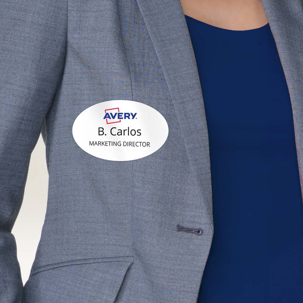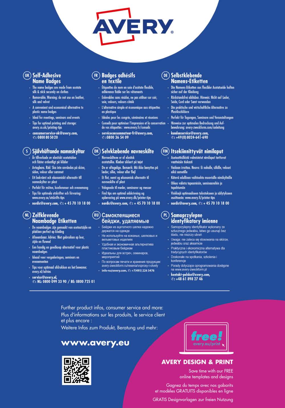 V zavitku je 20 listov, vseh skupaj je 200 priponk. Samolepilne priponke so narejene so iz acetatne svile, dobro se oprimejo oblačil in po odstranitvi ne puščajo sledi. Niso primerne za lepljenje na usnje, svilo, žamet in druge občutljive tkanine. Idealne so za seminarje, konference ali druge prireditve. Primerne so za tiskanje z laserskimi tiskalniki. Za oblikovanje uporabite brezplačni program, dostopen je na www.avery-zweckform.si.