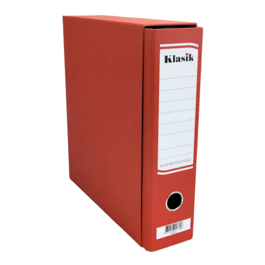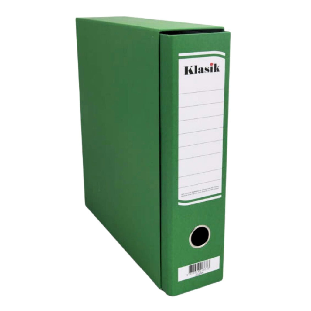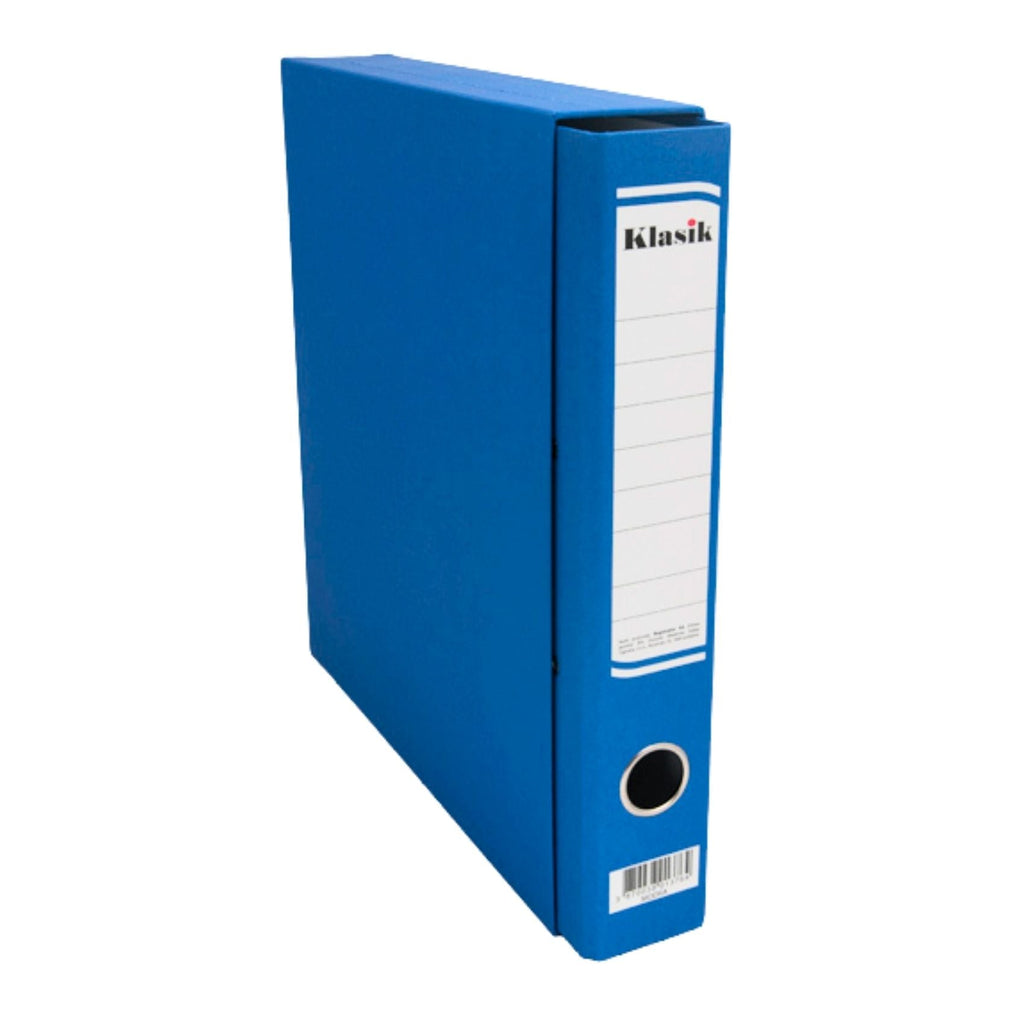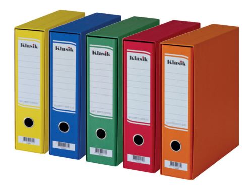 Registrator z dvižnim mehanizmom za shranjevanje luknjanih dokumentov. Trda, lepljena škatla. S PP-žepom za etiketo. Na voljo v dveh širinah hrbta: 50 mm ali 80mm.