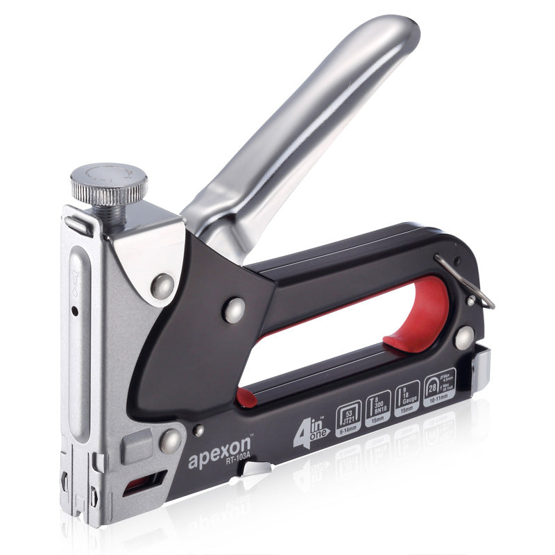 Profesionalni tapetniški spenjač 4 v 1s trpežno konstrukcijo iz jekla, z regulatorjem moči, nedrsečim barvnim spodnjim ročajem, vgrajenim odstranjevalcem sponk na zadnji strani, sistemom za polnjenje od zadaj in varnostno zapora ročaja. Primeren za sponke tipa A / 53 / JT21, žebljičke tipa E / št. 8 / 300 / BN18 / J (SWKBN) ali Kapaciteta sponk: 125, kapaicteta žebljičkov: 70. Dimenzije: 15,5 x 3,1 x 13,1 cm., teža: 546 g.