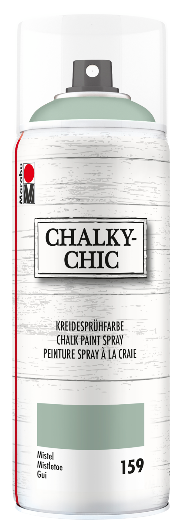 Kredni sprej Marabu Chalky-Chic Chalk Spray Paint. Dobro prekrivna, mat kredna barva na vodni osnovi, v spreju, naredi želeno površino žametno gladko s pridihom mat elegance. Barva je primerna za les, lesene vezane plošče, steklo, kovino, papier-mâché, karton, keramiko, platno, plastiko, rafijo itd. Zelo priročna je na neravnih in hrapavih površinah, kjer druge tehnike nanosa niso primerne. Če po nanosu barve uporabite še mat lak Chalky-Chic barva postane odporna na vremenske vplive in svetlobno dobro obstojna. Barva je suha v 10 minutah, ko dobi »prašnat« zaključek. Z rahlim brušenjem lahko dosežete učinek stare barve. Pred uporabo sprej dobro pretresite in za optimalen nanos sledite priloženim navodilom. Na voljo v številnih barvah, v 400 ml spreju.