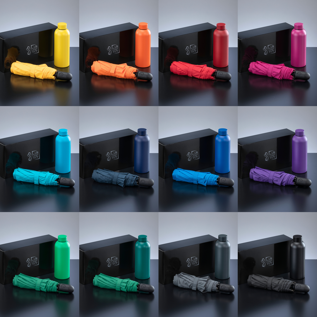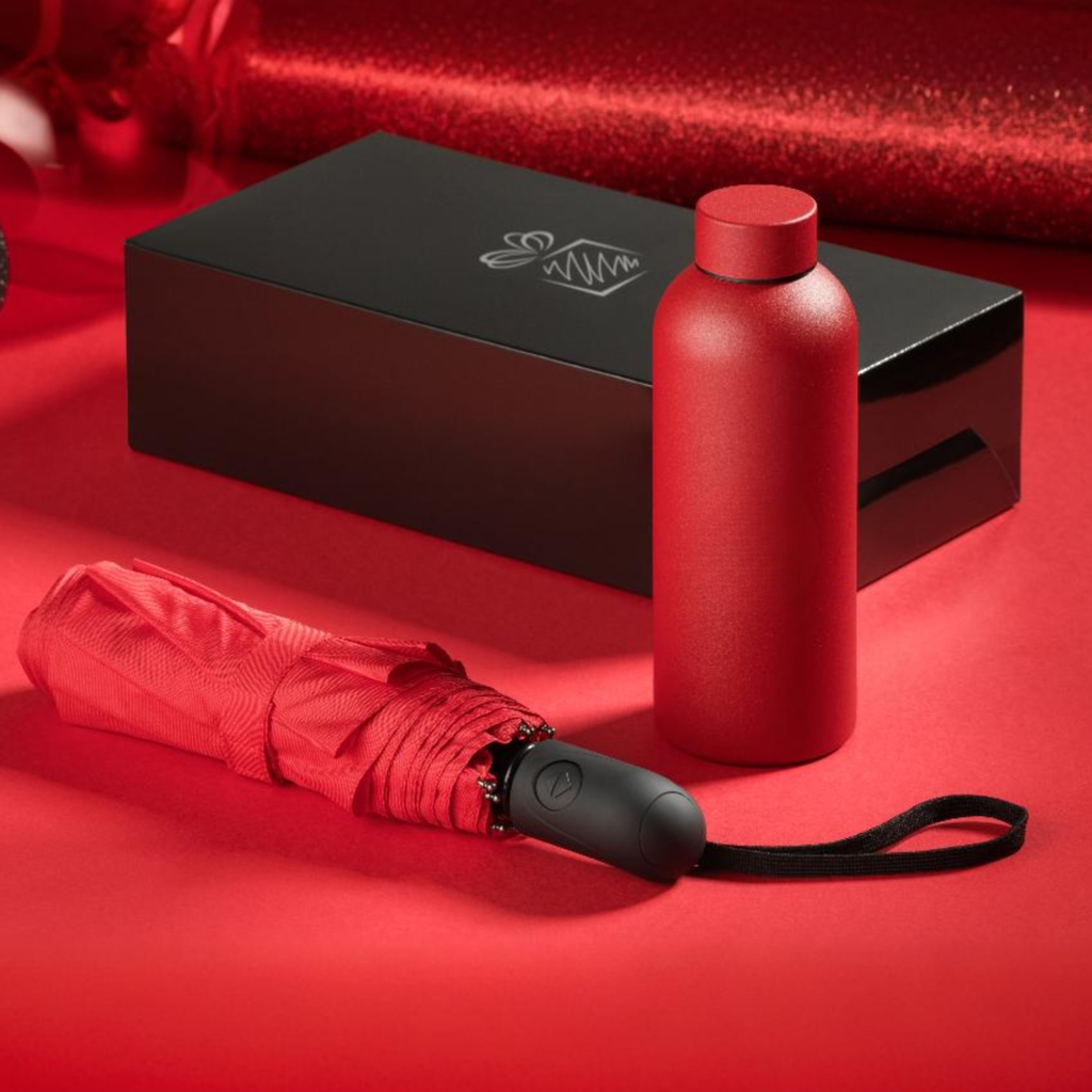 Ta komplet je popolna izbira za temačne, deževne in mrzle dni. Priročen, zložljivi dežnik in 500 ml steklenička, ki bo jutranjo kavo ohranila toplo do 8h, žive barve pa bodo vnesle kanček barvitosti v zimske dni.