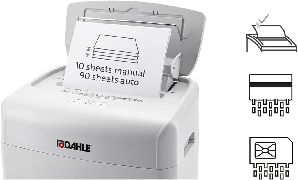 Dahle samodejni uničevalec dokumentov lahko naenkrat povsem avtomatično uniči do 90 listov (model ShredMATIC 90) oziroma 300 (model ShredMATIC 300) papirja s križnim razrezom visoke varnostne stopnje P4. Uničeni delčki so velikosti 4x12mm. Kadar uničujemo več dokumentov naenkrat samodejni uničevalci dokazano prihranijo do 98% časa, ki bi ga drugače zapravili za ročno podajanje papirja v standardni uničevalec. Vstavite sveženj papirja, zaprite pokrov in vaše delo je končano.