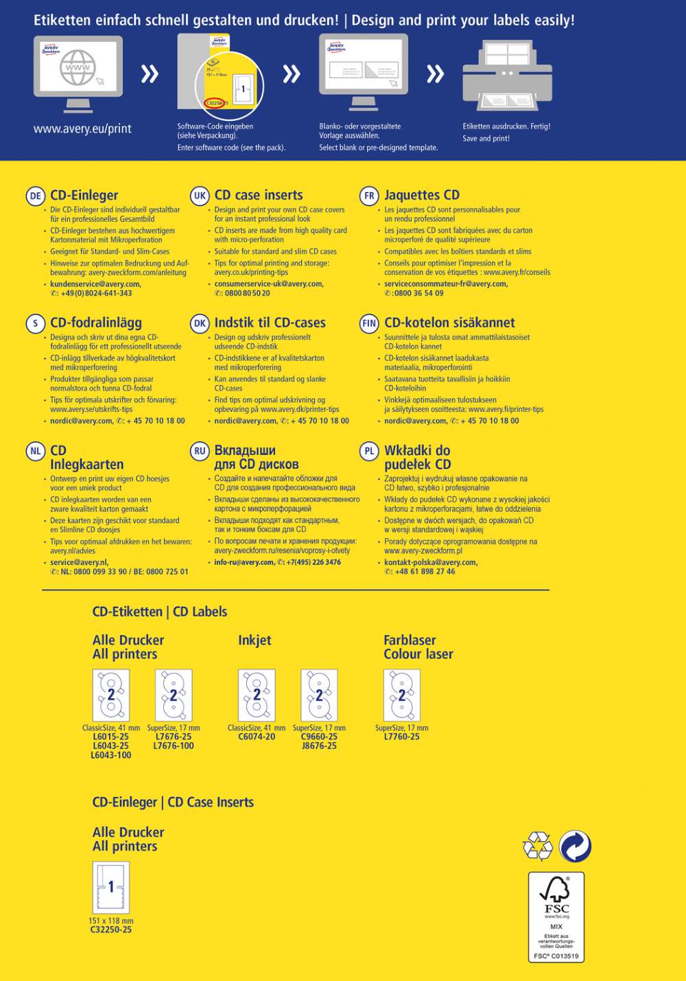 V zavitku je 25 vlagalnikov. Primerni so za tiskanje z vsemi običajnimi inkjet in laserskimi tiskalniki. Mikroperforirani vlagalniki so idealni za standardne CD škatlice, na enem listu je sprednja in zadnja stran. Imajo FSC® certifikat - izvor lesa je iz preverjenih in zanesljivih virov. Za oblikovanje uporabite brezplačni program, dostopen je na www.avery-zweckform.si.