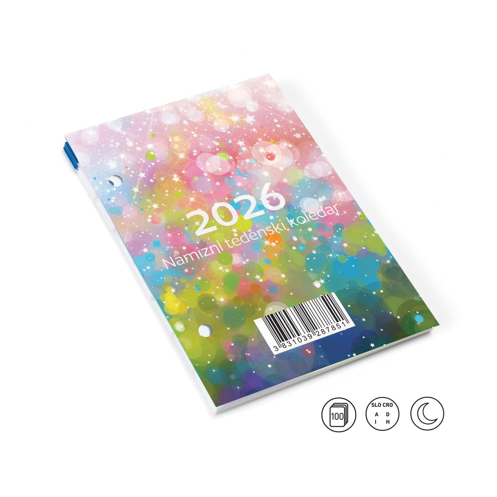 Za namizni koledar s pleksi ali pvc podstavkom, označeni prazniki držav SLO, A, I, CRO, H, D, lunine mene, krstna imena, s paskom.