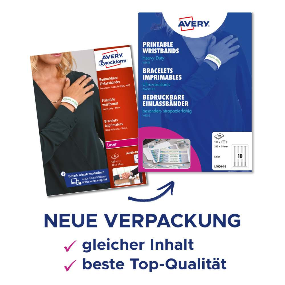 V zavitku je 10 listov, vseh zapestnic je 100. Narejene so iz folije, ki ne vsebuje PVC. Primerne so za tiskanje z laserskimi tiskalniki. Idealne za udeležence izobraževanj, seminarjev in drugih dogodkov . Zapestnice so odporne na vodo, umazanijo in trganje. Za oblikovanje uporabite brezplačni program, dostopen je na www.avery-zweckform.si.