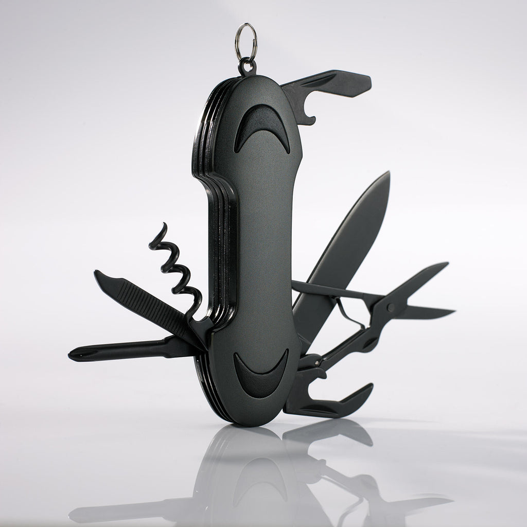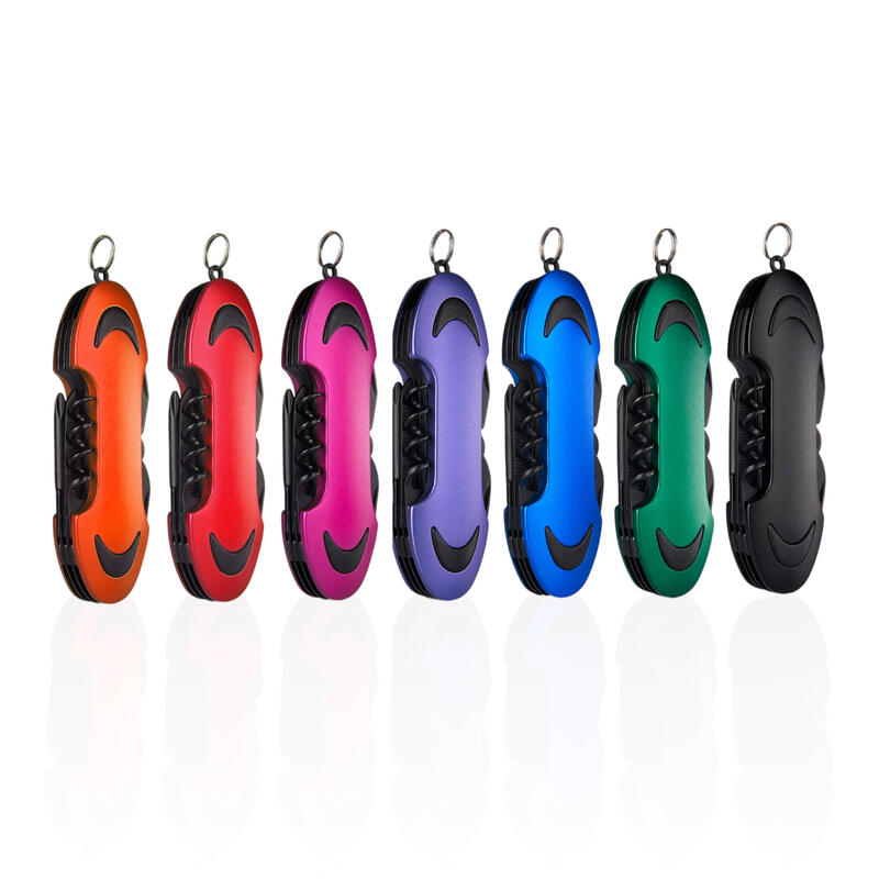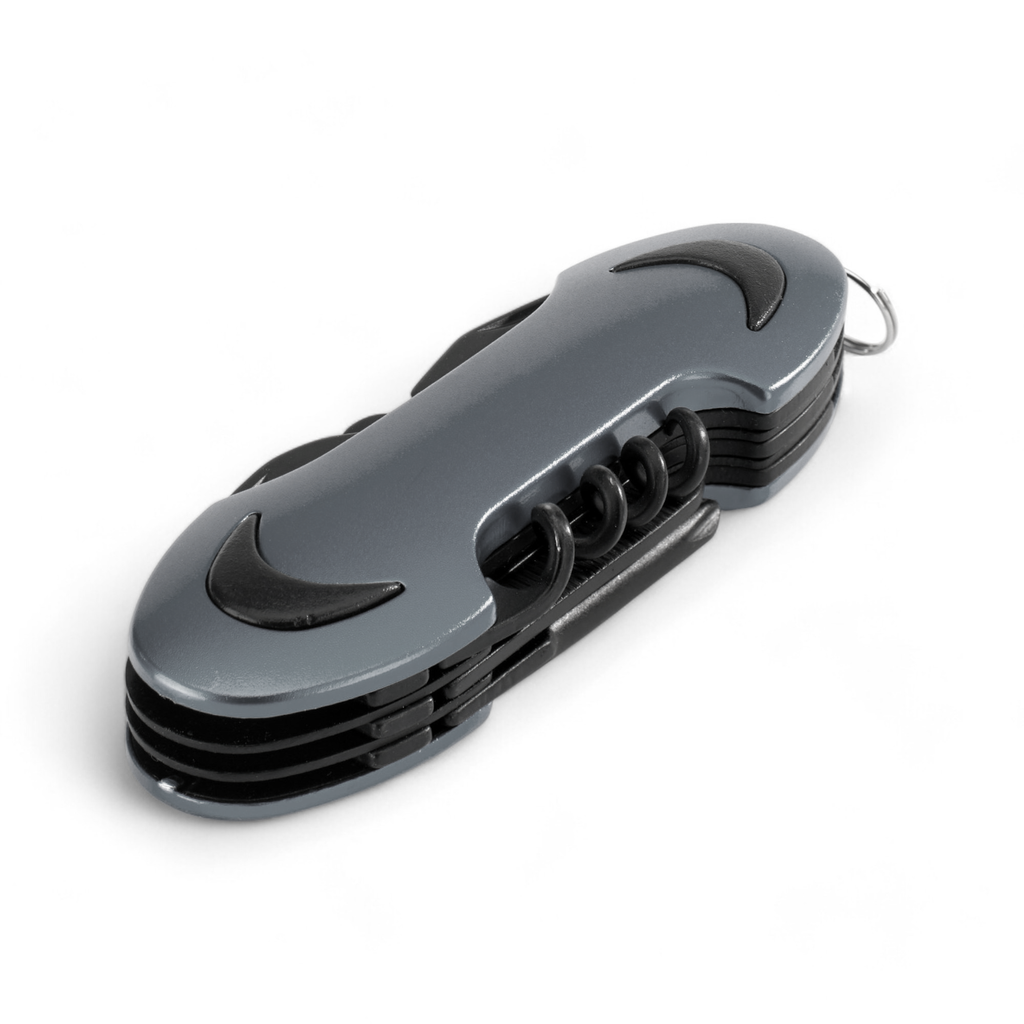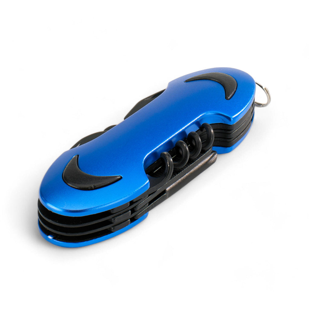 Zložljiv, izdelan iz nerjavečega jekla, z vgrajenim vijačnikom, odpiračem za steklenice, križnim izvijačem, pilico za nohte in škarjami. V darilni embalaži. 93 × 31 × 17 mm