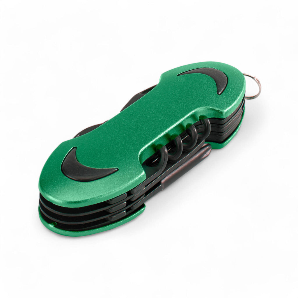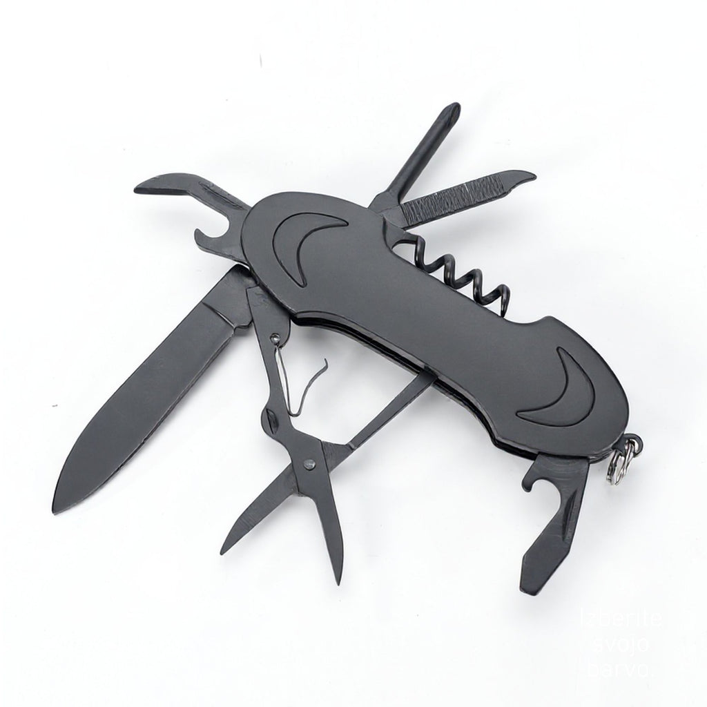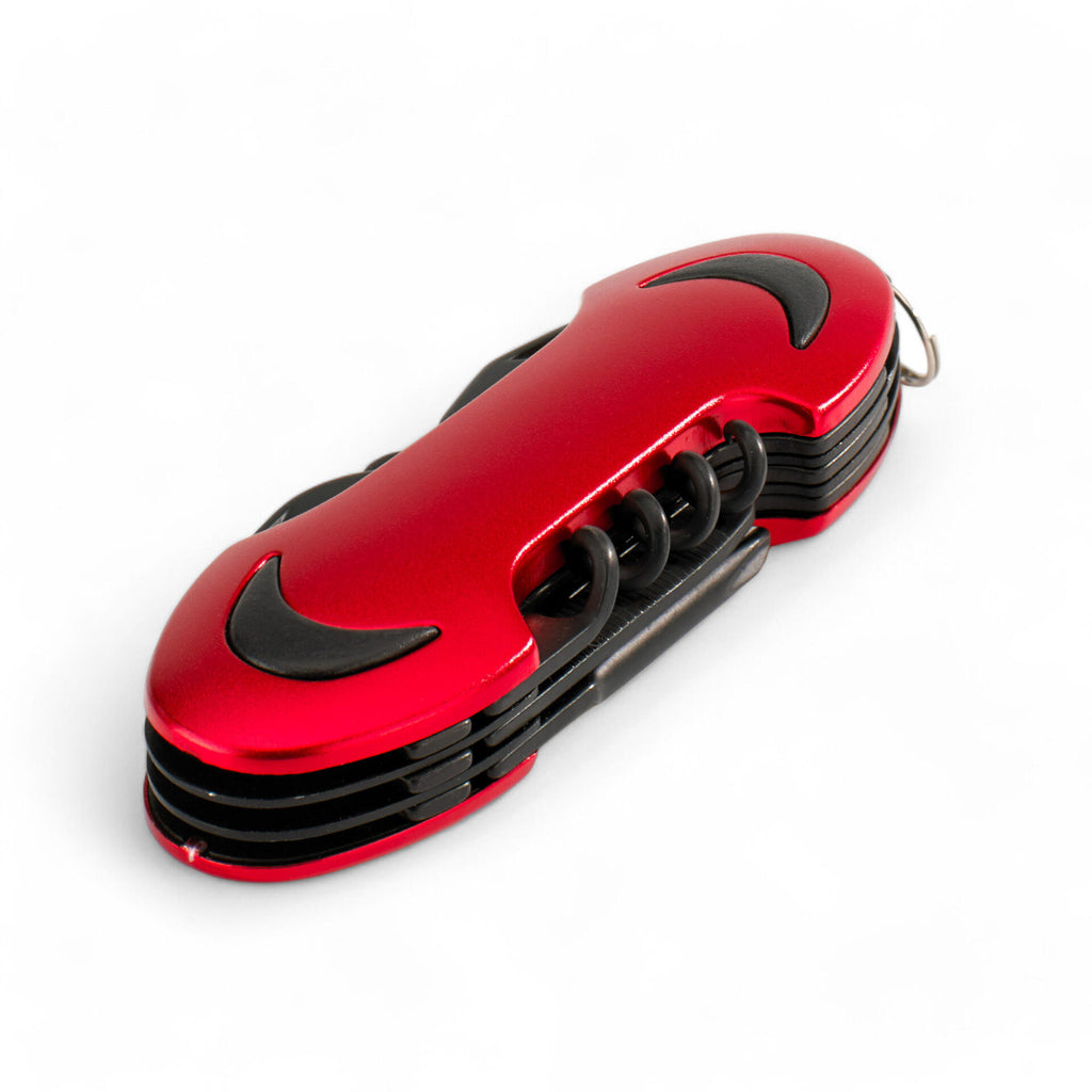 Zložljiv, izdelan iz nerjavečega jekla, z vgrajenim vijačnikom, odpiračem za steklenice, križnim izvijačem, pilico za nohte in škarjami. V darilni embalaži. 93 × 31 × 17 mm